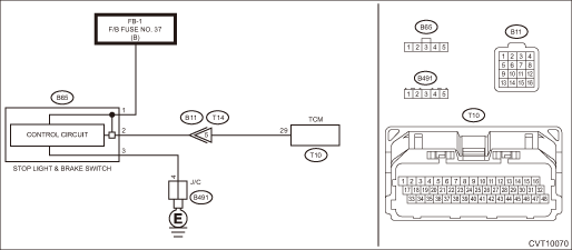 4.CHECK INPUT SIGNAL FOR TCM. 1) Install the fuse (No. 37). 2) Connect the TCM and stop light switch connector. 3) Depress the brake pedal. 4) Measure the voltage between TCM connector and chassis ground. Connector & terminal ENGINE TYPE FB (T10) No. 29 (+) — Chassis ground (−): ENGINE TYPE EZ (B54) No. 29 (+) — Chassis ground (−): | Is the voltage 10 V or more- | Diagnostic Procedure with Diagnostic Trouble Code (DTC) > DTC P0719 BRAKE SWITCH "B" CIRCUIT LOW | Replace the stop light switch. Stop Light Switch |