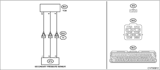 4.CHECK TRANSMISSION HARNESS. 1) Disconnect the secondary pressure sensor connector. 2) Turn the ignition switch to ON. 3) Measure the voltage between transmission connector and chassis ground. Connector & terminal (T4) No. 14 (+) — Chassis ground (−): (T4) No. 17 (+) — Chassis ground (−): | Is the voltage approx. 0 V- | Diagnostic Procedure with Diagnostic Trouble Code (DTC) > DTC P0843 TRANSMISSION FLUID PRESSURE SENSOR/SWITCH "A" CIRCUIT HIGH | Repair the short circuit of harness. |