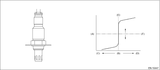 1. OUTLINE OF DIAGNOSIS Detect the stuck of rear oxygen sensor voltage in lean state. When rear oxygen sensor voltage remains below the threshold value for predetermined time, diagnosis interrupts target air fuel ratio for control and raises output voltage. Judge as NG detecting the stuck in lean state when rear oxygen sensor voltage remains below the threshold value even after the interrupt control. 2. COMPONENT DESCRIPTION (A) | Electromotive force | (B) | Air fuel ratio | (C) | Lean | (D) | Rich | (E) | Theoretical air fuel ratio | (F) | Comparative voltage |