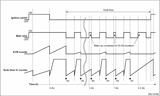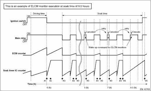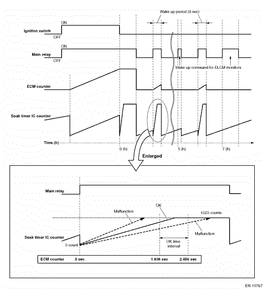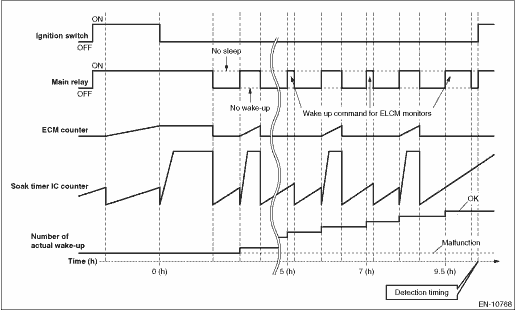 Wake-up at the predetermined interval until 5 or 7 or 9.5 hours have passed after the ignition switch is OFF, and compare the counter in soaking timer IC with the counter in ECM. Judge as malfunction if the counter in soaking timer IC is counted up to maximum value (1023 count) when the counter in ECM is 1636 ms, or if the counter in soaking timer IC is not counted up to maximum value (1023 count) when the counter in ECM is 2456 ms.