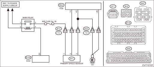 8.CHECK INPUT SIGNAL FOR TCM. 1) Turn the ignition switch to OFF. 2) Connect the transmission connector. 5) Set the select lever to “D” range. 6) Read the data of «Primary Pulley Speed» using Subaru Select Monitor. | Does the value of «Primary Pulley Speed» change according to those of «Turbine Revolution Speed»- | Current condition is normal. Repair the poor contacts of harnesses of primary speed sensor and transmission connector. | Diagnostic Procedure with Diagnostic Trouble Code (DTC) > DTC P2747 INTERMEDIATE SHAFT SPEED SENSOR "B" CIRCUIT NO SIGNAL |