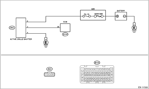 3.CHECK HARNESS BETWEEN ECM AND ACTIVE GRILLE SHUTTER CONNECTOR. 1) Turn the ignition switch to OFF. 2) Disconnect the battery. 3) Disconnect the connectors from ECM and active grille shutter. 4) Measure the resistance between active grille shutter connector and chassis ground. Connector & terminal (B63) No. 3 — Chassis ground: | Is the resistance 1 M- or more- | Diagnostic Procedure with Diagnostic Trouble Code (DTC) > DTC U0284 LOST COMMUNICATION WITH ACTIVE GRILLE SHUTTER MODULE "A" | Repair the short circuit to ground in harness between ECM and active grille shutter connector. |