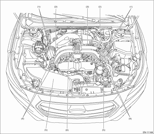 3. SOLENOID VALVE, ACTUATOR, EMISSION CONTROL SYSTEM PARTS AND IGNITION SYSTEM PARTS (1) | Fuel injector | (3) | Purge control solenoid valve | (5) | Intake oil control solenoid | (2) | Tumble generator valve actuator | (4) | Ignition coil | (6) | EGR control valve |