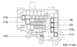 (1) | Starter | (6) | Starter cut relay | (11) | Electronic throttle control relay | (2) | Fuel pump | (7) | Push button ignition switch | (12) | Fuel pump relay | (3) | IG1 relay | (8) | Radiator main fan relay 2 | (13) | Main relay | (4) | Starter relay | (9) | Radiator main fan relay 1 | (14) | IG1 relay (push button start) | (5) | IG2 relay | (10) | Radiator sub fan relay | | |