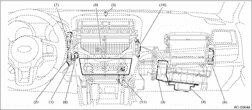 2. PASSENGER COMPARTMENT (1) | Evaporator sensor | (5) | Sunload sensor | (9) | A/C control panel | (2) | Air mix door actuator*1 or air mix door actuator LH*2 | (6) | Intake door actuator | (10) | Air mix door actuator RH*2 | (3) | A/C CM | (7) | Mode door actuator | (11) | Rear vent actuator*3 | (4) | Blower motor | (8) | In-vehicle sensor | |