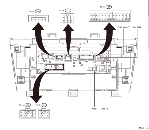 NOTE: *1: Different audio tunings are used on SDN model and OUTBACK model. Therefore, connection is selectively established as follows: For the sedan model, connection is established to GND. For the OUTBACK model, connection is not established. *2: Different audio tunings are used on RHD model and LHD model. Therefore, connection is selectively established as follows: For the RHD model, connection is established to GND. For the LHD model, connection is not established. |