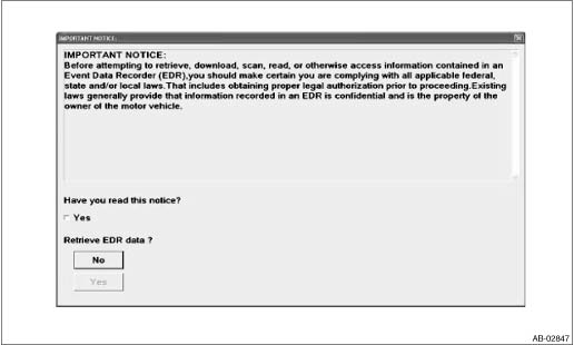 1. On «Start» display, select «Diagnosis». 2. On «Vehicle selection» display, input the target vehicle information and select «Confirmed». 3. On «Main Menu» display, select «Each System». 4. On «Select System» display, select «Airbag» and select «Enter». 5. On «Airbag» display, select «Work Support». 6. On «Work Support item» display, select «Event Record Data». After selection, «IMPORTANT NOTICE» screen is displayed. 7. After checking the content of «IMPORTANT NOTICE», click the checkbox for “Yes”. 8. If the applicable law is not violated, click the «Yes» button to display the EDR data.