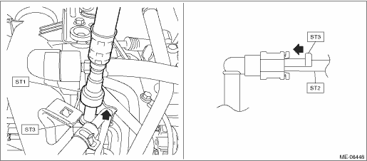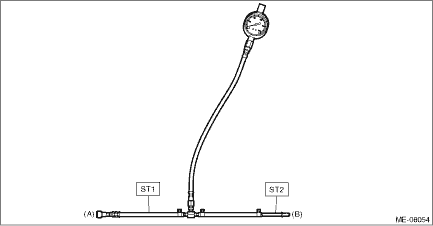(3) Connect the fuel pressure gauge with ST1 and ST2. CAUTION: • Check that there is no damage or dust on the quick connector. If necessary, clean the seal surface of the pipe. • Make sure that the quick connector is securely connected. NOTE: ST1 is a SUBARU genuine part.