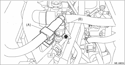 2. Start the engine and run it until it stalls. 3. After the engine stalls, crank it for five more seconds. 4. Turn the ignition switch to OFF. 5. Install the fuse of fuel pump to the main fuse box. 2. DRAINING FUEL (WITH SUBARU SELECT MONITOR) WARNING: Place “NO OPEN FLAMES” signs near the working area. CAUTION: Be careful not to spill fuel. NOTE: • If the fuel pump cannot be driven, refer to the procedures for draining from the fuel filler hose. Fuel > PROCEDURE • Be careful not to let the battery run-out. • Be aware that the fuel may remain in the fuel tank after draining the fuel. 1. Release the fuel pressure. Fuel > PROCEDURE 2. Remove the clip (A) securing the fuel delivery tube. 3. Attach the ST to the fuel pipe assembly, and push the ST in the direction of arrow mark to disconnect the fuel delivery tube (B).