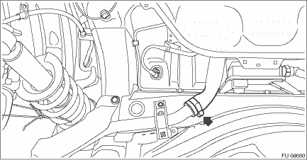 5. Connect the gasoline proof hose to ST and put the end of the hose in the container. 6. Drive the fuel pump and drain the fuel using Subaru Select Monitor. CAUTION: Be careful not to spill fuel. NOTE: For detailed operation procedures, refer to “PC application help for Subaru Select Monitor”. 7. Install the related parts in the reverse order after draining the fuel. CAUTION: • Be careful not to spill fuel. • Catch the fuel from the tubes using a container or cloth. • Check that there is no damage or dust on the quick connector. If necessary, clean the seal surface of the pipe. • Make sure that the quick connector is securely connected. 3. DRAINING FUEL (THROUGH THE FUEL FILLER HOSE) • Sedan model WARNING: Place “NO OPEN FLAMES” signs near the working area. CAUTION: • Be careful not to spill fuel. • Fuel may remain in the fuel filler pipe. Drain the fuel from the fuel filler pipe through the fill opening using the gasoline proof pump and the gasoline proof hose (o10 or less) before the operation. NOTE: Be aware that the fuel may remain in the fuel tank after draining the fuel. 1. Lift up the vehicle. 2. Remove the rear sub frame. Rear Sub Frame > REMOVAL 3. Open the fuel filler lid and remove the fuel filler cap. 4. Drain the fuel from the fuel filler pipe through the filler opening using the gasoline proof pump and the gasoline proof hose (o10 or less). 5. Disconnect the fuel filler hoses from the fuel filler pipe. CAUTION: • Be careful not to spill fuel. • Catch the fuel from hoses using a container or cloth.