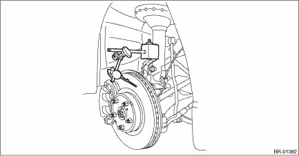 1. DISC ROTOR RUNOUT CHECK 1. Check the hub unit COMPL - front axle for free play and runout before the inspection of disc rotor runout limit. Front Hub Unit Bearing > INSPECTION 2. Tighten the wheel nuts to secure disc rotor. 3. Set a dial gauge 10 mm (0.39 in) inward from the disc rotor outer circumference, and check the disc rotor runout while rotating the disc rotor. Disc rotor runout limit: 0.05 mm (0.0020 in)