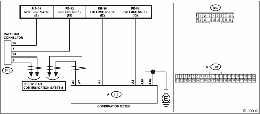 1. COMMUNICATION FOR INITIALIZING IMPOSSIBLE DETECTING CONDITION: • Defective harness connector • Power supply circuit malfunction • Defective combination meter • Defective CAN communication circuit • Defective Subaru Select Monitor TROUBLE SYMPTOM: Communication is impossible between combination meter and Subaru Select Monitor. WIRING DIAGRAM: NOTE: For the coupling connector, refer to “WIRING SYSTEM”. • Combination meter system Combination Meter System > WIRING DIAGRAM • CAN communication system CAN Communication System > WIRING DIAGRAM