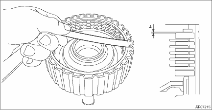 • Inspect the drive plate facing for wear and damage. • Driven plate for discoloration (burned color) • Make sure the snap ring is not worn and the return spring has no permanent distortion, damage, or deformation. • Check the lip seal for damage. • Inspect the extension end play, and adjust it to within the standard value. Transfer Clutch > ADJUSTMENT 1. Before measuring clearance “A” between snap ring and driven plate, place same thickness shims on both sides to prevent the plate from tilting. 2. When clearance “A” exceeds the limit for use, replace the drive plate and driven plate as a set, and select the pressure plate within the initial specified value. Initial standard: 0.7 — 1.1 mm (0.028 — 0.043 in) Limit thickness: 1.45 mm (0.057 in)