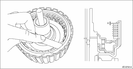• Inspect the drive plate facing for wear and damage. • Driven plate for discoloration (burned color) • Make sure the snap ring is not worn and the return spring has no permanent distortion, damage, or deformation. • Check the lip seal for damage. • Inspect the extension end play, and adjust it to within the standard value. Transfer Clutch > ADJUSTMENT 1. Before measuring clearance “A” between snap ring and retaining plate, place same thickness shims on both sides to prevent the retaining plate from tilting. 2. When clearance “A” exceeds the limit for use, replace the drive plate and driven plate as a set, and select the pressure plate within the initial specified value. Initial standard: 0.7 — 1.1 mm (0.028 — 0.043 in) Limit thickness: 1.6 mm (0.063 in)