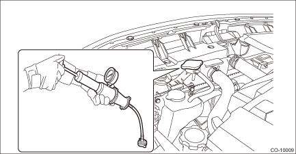 4. Apply a pressure of 157 kPa (1.6 kg/cm2, 23 psi) to the radiator and check the following points: • Leakage from the radiator or its vicinity • Leakage from the hose or its connections CAUTION: • Engine should be turned off. • Clean the check points. • Be careful not to deform the filler neck of radiator when installing and removing the radiator cap tester. • Be careful of engine coolant from spurting out when removing the radiator cap tester. |