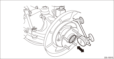 2. Inspect axial play of the hub unit bearing. (1) Remove the tire and disc rotor. (2) Inspect the lean of axis direction using a dial gauge. Replace the hub unit COMPL if the play exceeds the limit. Service limit: Maximum: 0.05 mm (0.0020 in)
