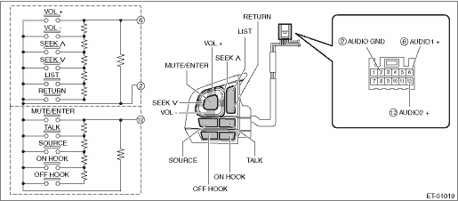 1. SATELLITE SWITCH ASSEMBLY 1. Measure the resistance between connector terminals. Terminal No. | Inspection conditions | Standard | 6 — 2 | VOL (+) VOL (−) SEEK ( ) SEEK ( ) LIST RETURN | A circuit is all OFF. | Approx. 100 k- | VOL (+) | ON | Less than 1 - | VOL (−) | ON | Approx. 50 - | Preset CH UP/SEEK ( ) | ON | Approx. 120 - | Preset CH DOWN/SEEK ( ) | ON | Approx. 230 - | LIST | ON | Approx. 430 - | RETURN | ON | Approx. 1,000 - | 12 — 2 | MUTE/ENTER TALK SOURCE ON HOOK OFF HOOK | B circuit is all OFF. | Approx. 100 k- | MUTE/ENTER | ON | Less than 1 - | TALK | ON | Approx. 50 - | SOURCE | ON | Approx. 120 - | ON HOOK | ON | Approx. 230 - | OFF HOOK | ON | Approx. 430 - |