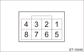(2) Apply battery voltage between the connector terminals to check lighting condition of illumination inside the switch. Terminal No. | Inspection conditions | Specification | 8 (+) — 2 (−) | Apply battery voltage. | Light ON |