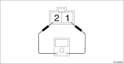 1. Check that the fuel injector has no deformation, cracks or other damages. 2. Measure the resistance between fuel injector terminals. Terminal No. | Standard | 1 and 2 | Approx. 12.0 - (when 20°C (68°F)) |