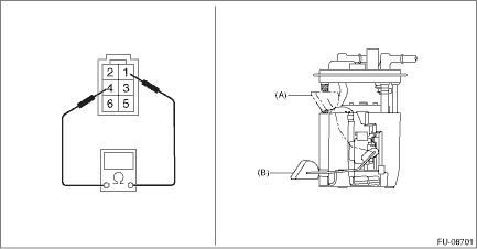3. Check the resistance between fuel level sensor terminals by the connector on top of the fuel pump. Float position | Terminal No. | Standard | FULL (A) | 1 and 4 | 8.7±1.0 - | EMPTY (B) | 139.1±2.0 - |