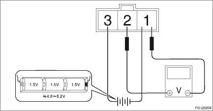 1. Check that the manifold absolute pressure sensor has no deformation, cracks or other damages. 2. Connect dry-cell battery positive terminal to terminal No. 3 and dry-cell battery ground terminal to terminal No. 1, circuit tester positive terminal to terminal No. 2 and the circuit tester ground terminal to terminal No. 1. NOTE: • Use new dry-cell batteries. • Using circuit tester, check that the initial voltage of a single dry-cell battery is 1.6 V or more. And also check that the voltage of three batteries in series is between 4.8 V and 5.2 V. • For power supply, 5 V DC voltage source can also be used.