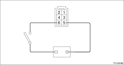 1. Check that the fuel pump has no deformation, cracks or other damages. 2. Connect the battery positive terminal to terminal No. 5 and the battery ground terminal to terminal No. 6, and inspect the fuel pump operation. WARNING: • Wipe off fuel completely. • Keep the battery as far apart from fuel pump as possible. • Do not run the fuel pump for a long time under non-load condition.