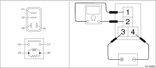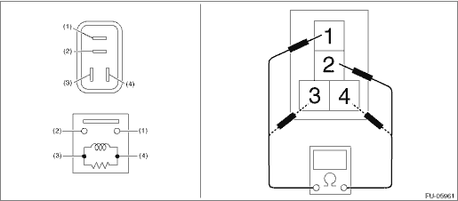 3. Connect battery positive terminal to terminal No. 3 and battery ground terminal to terminal No. 4, and measure the resistance between the fuel pump relay terminals.