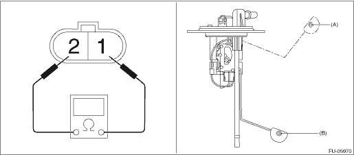3. Measure the resistance between fuel sub level sensor terminals. Float position | Terminal No. | Standard | FULL (A) | 1 and 2 | 8.7±1.0 - | EMPTY (B) | 270.9±4.0 - |
