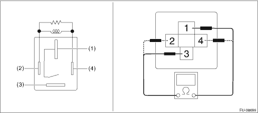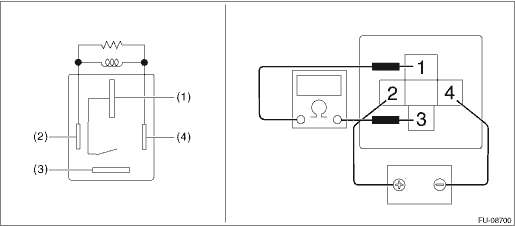 3. Connect battery positive terminal to terminal No. 2 and battery ground terminal to terminal No. 4, and measure the resistance between the main relay terminals.