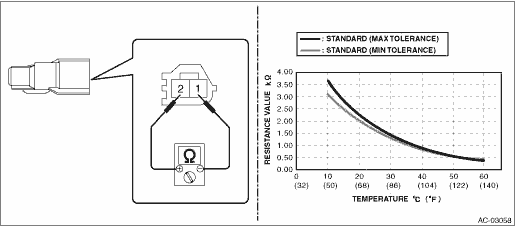 1. Visually check the ambient sensor for dirt or damage, and clean or replace as necessary. 2. Measure the resistance between ambient sensor terminals. CAUTION: During inspection, be careful not to touch the sensor end in order to avoid misjudgment due to body temperature. Preparation tool: Circuit tester