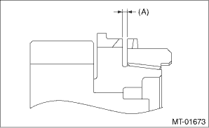 Disassembled parts should be washed with cleaning solvent first, then inspected carefully. 1. Bearing Replace the bearings in the following cases. • When the bearing balls, outer races and inner races are broken or rusty. • When the bearing is worn. • When the bearings fail to turn smoothly or emit noise in rotation after transmission gear oil has been applied. • When bearing has other defects. 2. Bushing (each gear) Replace the bushing in following cases. • When the sliding surface is damaged or abnormally worn. • When the inner wall is abnormally worn. 3. Gear Replace gears in the following cases. • Replace the gear with new part if its tooth surfaces are broken, damaged or excessively worn. • Correct or replace if the cone that contacts the baulk ring is rough or damaged. • Repair or replace if the inner surface or end face is damaged. 4. Baulk ring, synchro cone Replace the baulk ring and synchro cone in the following cases. • When the inner surface or end face is damaged. • When the baulk ring inner surface is abnormally or partially worn down. • When the contact surface of the baulk ring insert section is cracked or abnormally worn. • If the gap between the end faces of the baulk ring and the gear splined part is excessively small, check the clearance (A) while pressing the ring against the cone. Clearance (A): 0.5 mm (0.020 in) or more Single cone