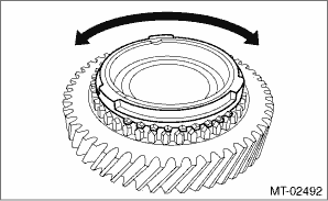 • Apply transmission gear oil to the cone of the gear and while press-fitting the baulk ring, check there is no rotation in the circumferential direction.