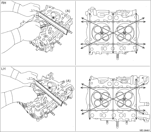 1. CYLINDER HEAD 1. Visually inspect to make sure that there are no cracks, scratches or other damage. 2. Use liquid penetrant tester on the important sections to check for fissures. 3. Check that there are no marks of gas leaking or water leaking on gasket attachment surface. 4. Check the warping of the cylinder head mating surface that mates with cylinder block at the locations shown in the figure using a straight edge (A) and thickness gauge (B). If it exceeds the limit, correct the surface by grinding it with a surface grinder or replace the cylinder head. NOTE: • Measurement should be performed at a temperature of 20°C (68°F). • If there is warpage on the cylinder head mating surface, the cylinder head bolt tightening torque and angle tightening may be improper. When installing the cylinder head, make sure that tightening torque and angle tightening work is performed precisely according to the operation procedures. • When the cylinder head is replaced, lap each valve. Refer to “VALVE SEAT” for lapping. Cylinder Head > INSPECTION Cylinder head warpage: Limit 0.020 mm (0.00079 in) Cylinder head grinding limit: To 98.4 mm (3.874 in) Cylinder head height: Standard 98.5 mm (3.878 in)