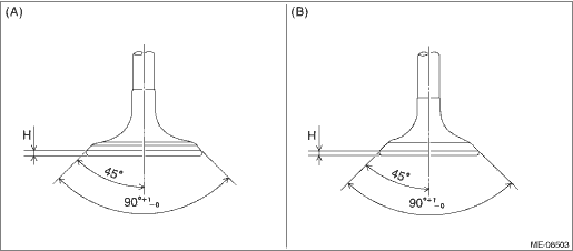 2. VALVE & VALVE GUIDE 1. Check the valve flange and stem for damage, wear or deformation. 2. Measure the thickness “H” of valve head edge as shown in the figure using a caliper gauge. If it is not within the standard, replace the valve. NOTE: • It is possible to differentiate between the intake valve and the exhaust valve by their overall length. Valve overall length: Intake 104.95 mm (4.132 in) Exhaust 96.5 mm (3.799 in) • When the valve is replaced, lap the valve. Refer to “VALVE SEAT” for lapping. Cylinder Head > INSPECTION Valve head edge thickness H: Intake (A) Standard 0.8 — 1.2 mm (0.031 — 0.047 in) Exhaust (B) Standard 1.0 — 1.4 mm (0.039 — 0.055 in)