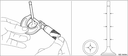 3. Check the clearance between valve and valve guide. Check the clearance between valve and valve guide by measuring the outer diameter of valve stem and the inner diameter of valve guide respectively. (1) Measure the outer diameter of valve stem with a micrometer. If it is not within the standard, replace the valve. NOTE: • Measurement should be performed at a temperature of 20°C (68°F). • Measure the outer diameter of the valve stem at the six locations as shown in the figure, and read the value of most worn location. • When the valve is replaced, lap the valve. Refer to “VALVE SEAT” for lapping. Cylinder Head > INSPECTION Valve stem outer diameter: Intake Standard 5.455 — 5.470 mm (0.2148 — 0.2154 in) Exhaust Standard 5.445 — 5.460 mm (0.2144 — 0.2150 in)