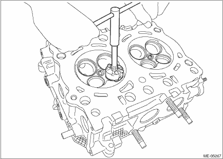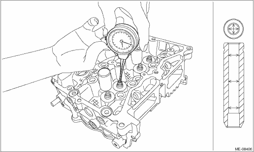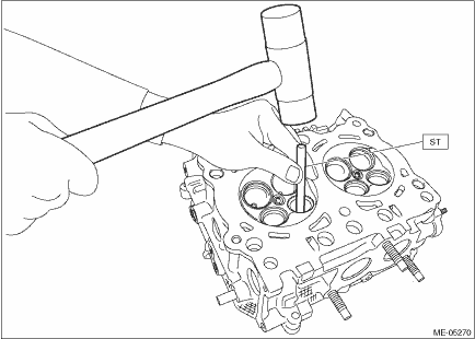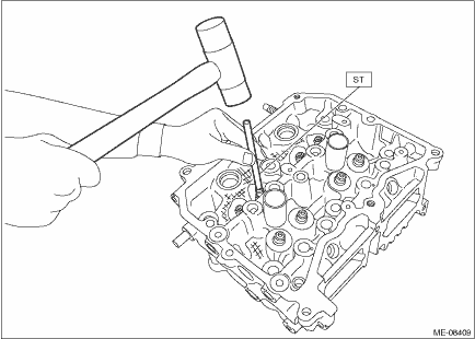 (3) Calculate the clearance between valve and valve guide. Clearance between valve and valve guide: Intake Standard 0.030 — 0.057 mm (0.0012 — 0.0022 in) Exhaust Standard 0.040 — 0.067 mm (0.0016 — 0.0026 in) 4. If the clearance between valve and valve guide exceeds the standard, replace the valve or valve guide, whichever shows the greater amount of wear or damage. For replacement procedure of valve guide, refer to the following. NOTE: When the valve is replaced, lap the valve. Refer to “VALVE SEAT” for lapping. Cylinder Head > INSPECTION (1) Insert ST into the valve guide with the combustion chamber upward and remove the valve guide using plastic hammer. CAUTION: • Place a wood board wrapped with a waste cloth to stabilize the cylinder head before work. • Use special care not to damage the cylinder head during work. • Always strike the ST vertically with a plastic hammer. Otherwise, the ST can be damaged.