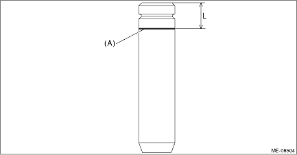(2) Before installing the valve guide, make sure that neither scratches nor damages exist on the inner surface of valve guide installation holes of cylinder head. (3) Draw a reference line (A) for insert on the valve guide using a marker as shown in the figure. NOTE: • Use a new valve guide. • A reference line for insert is used as a guide when tapping-in the valve guide. Valve guide inserting reference line position L: 15 mm (0.5906 in)