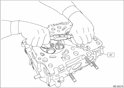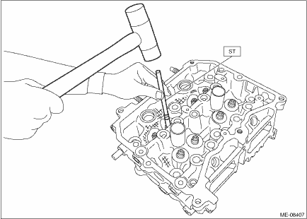 (4) Apply a enough coat of engine oil to the valve guide, and set the valve guide on the cylinder head with the combustion chamber downward. (5) Insert the ST into the valve guide, and tap-in the valve guide to the reference line (A) for insert using plastic hammer. CAUTION: • During work, place a waste cloth, etc. to avoid scratching the mating surface of the cylinder head. • Use special care not to damage the cylinder head during work. • Always strike the ST vertically with a plastic hammer. Otherwise, the ST can be damaged.
