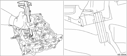(6) Measure the valve guide protrusion amount “L” as shown in the figure using a caliper gauge. Insert the ST into the valve guide again, and tap-in the valve guide so that it is positioned within standard by referring to the measured value using plastic hammer. CAUTION: • During work, place a waste cloth, etc. to avoid scratching the mating surface of the cylinder head. • Use special care not to damage the cylinder head during work. • Always strike the ST vertically with a plastic hammer. Otherwise, the ST can be damaged. NOTE: Be careful not to tap-in excessively by repeating the steps of Tapping-in > Measurement > Tapping-in > Measurement … when installing the valve guide.