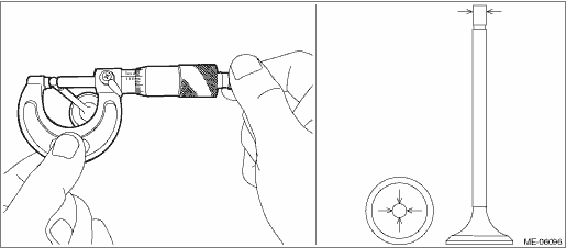 (8) After reaming, clean the valve guide to remove chips. (9) Check the seating width between valve and valve seat. Cylinder Head > INSPECTION 3. VALVE & VALVE SHIM 1. Visually check the valve shim for damage. 2. Check the clearance between valve and valve shim. Check the clearance between valve and valve shim by measuring the outer diameter of valve stem end and the inner diameter of valve shim respectively. (1) Measure the outer diameter of valve stem end with a micrometer. If it is not within the standard, replace the valve. NOTE: • Measurement should be performed at a temperature of 20°C (68°F). • Measure the outer diameter of the valve stem end at the two locations as shown in the figure, and read the value of most worn location. • When the valve is replaced, lap the valve. Refer to “VALVE SEAT” for lapping. Cylinder Head > INSPECTION Valve stem end outer diameter: Intake Standard 5.455 — 5.470 mm (0.2148 — 0.2154 in) Exhaust Standard 5.445 — 5.460 mm (0.2144 — 0.2150 in)