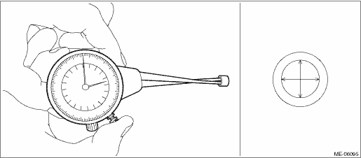 (2) Using a caliper gauge, measure the inner diameter of valve guide. If it is not within the standard, replace the valve guide. For replacement procedure, refer to step 4). NOTE: • Measurement should be performed at a temperature of 20°C (68°F). • Measure the inner diameter of the valve guide at the six locations as shown in the figure, and read the value of most worn location. Valve guide inner diameter: Standard 5.500 — 5.512 mm (0.2165 — 0.2170 in)
