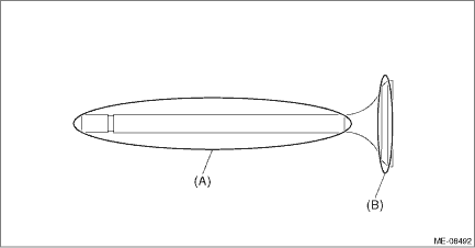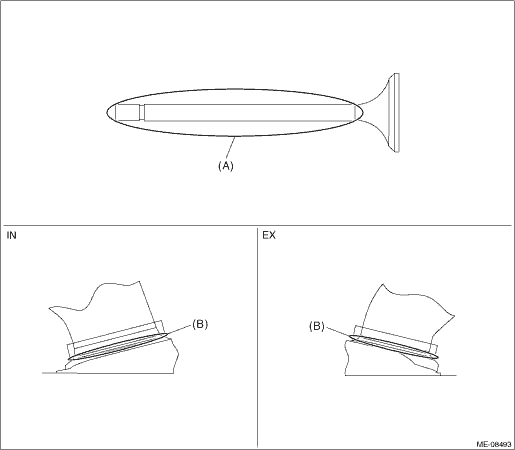 (5) Wipe off the red dye on the valve and valve seat completely. (6) Coat the stem (A) of the valve lightly with engine oil and apply red dye evenly on the seating surface (B) between valve and valve seat.