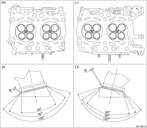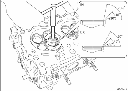 (2) Lap the valve. For lapping procedure of the valve, refer to step 4). (3) Check the seating position between valve and valve seat. For inspection of the seating position between valve and valve seat, refer to step 2). NOTE: This procedure is necessary to select a seat cutter to be used in step (4). (4) Using a seat cutter, correct the valve seat so that the seating width between valve and valve seat becomes the standard value. NOTE: • Select a proper valve seat cutter according to the following table.