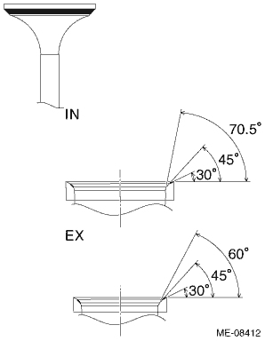 (9) After inspection, wipe off the red dye completely. 3. When correcting the seating surfaces of valve seat (1) Correct the seating angle between valve and valve seat using the 45° valve seat cutter. NOTE: • Select the size of the valve seat cutter by referring to the outer diameters of the intake valve head and exhaust valve head. Valve head outer diameter: Intake 35.9 — 36.1 mm (1.413 — 1.421 in) Exhaust 27.9 — 28.1 mm (1.098 — 1.106 in) • Grind the seating surface so that the seating width between valve and valve seat becomes slightly larger than the standard value. • Gradually reduce pressure at the end of grinding process in order to avoid creating a gap on the valve seat correcting surface. Seating angle between valve and valve seat: 45°