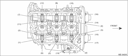 7. Measure the oil clearance of camshaft journal. (1) Clean the camshaft cap and cylinder head camshaft journal. (2) Place the camshaft on cylinder head. (Without installing the valve lifter) (3) Place a plastigauge across each camshaft journals. (4) Gradually tighten the camshaft cap in at least two stages in the numerical order shown in the figure, then tighten to specified torque. Do not turn the camshaft. Tightening torque: (1) — (12): 16 N·m (1.6 kgf-m, 11.8 ft-lb) (13) — (17): 9.75 N·m (1.0 kgf-m, 7.2 ft-lb)