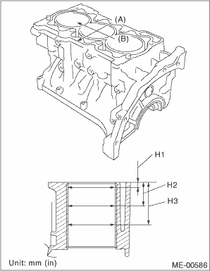2. Measure inner diameter of each cylinder. Measure the inner diameter of each cylinder in both the thrust and piston pin directions at the heights as shown in the figure, using a cylinder bore gauge. NOTE: Measurement should be performed at a temperature of 20°C (68°F). • Calculate the cylindricality of cylinder liner by using the following formula.