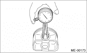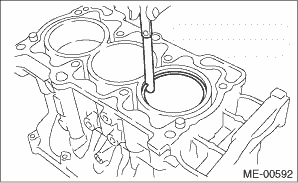 5. Calculate the clearance between cylinder and piston. NOTE: Measurement should be performed at a temperature of 20°C (68°F). Clearance between cylinder and piston at 20°C (68°F): Standard −0.010 — 0.010 mm (−0.0004 — 0.0004 in) 6. Boring and honing: (1) If any of the measured value of cylindricality, out-of-roundness or cylinder-to-piston clearance is out of standard or if there is any damage on the cylinder wall, rebore it to replace with an oversize piston. CAUTION: When any of the cylinders needs reboring, all other cylinders must be bored at the same time, and replaced with oversize pistons. (2) If the cylinder inner diameter exceeds the limit after boring and honing, replace the cylinder block. NOTE: Immediately after reboring, the cylinder diameter may differ from its real diameter due to temperature rise. Thus, when measuring the cylinder diameter, wait until it has cooled to room temperature. Cylinder inner diameter boring limit (diameter): To 92.515 mm (3.6717 in) 3. PISTON AND PISTON PIN 1. Check the piston and piston pin for damage, cracks or wear. Replace if faulty. 2. Check the piston ring groove for wear or damage. Replace if faulty. 3. Make sure that the piston pin can be inserted into the piston pin hole with a thumb at 20°C (68°F). Replace if faulty. Clearance between piston pin hole and piston pin: Standard 0.004 — 0.008 mm (0.0002 — 0.0003 in)