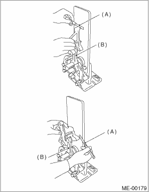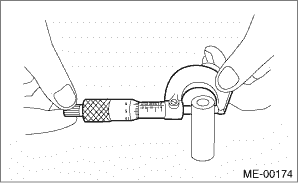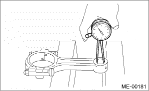 3. Install the connecting rod with bearings attached to the crankshaft, and using a thickness gauge, measure the thrust clearance. If the thrust clearance exceeds the standard or uneven wear is found, replace the connecting rod. Connecting rod thrust clearance: Standard 0.070 — 0.330 mm (0.0028 — 0.0130 in)