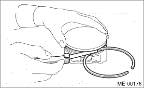5. Check the piston pin snap ring for distortion, cracks and wear. 4. PISTON RING 1. If the piston ring is broken, damaged or worn, or if its tension is insufficient, or when the piston is replaced, replace the piston ring with a new part of the same size as piston. NOTE: • The top ring and second ring have the mark to determine the direction for installing. When installing the ring to piston, face marks to the top side. • Oil ring consists of the upper rail, expander and lower rail. When installing to the piston, be careful of the direction of each rail.