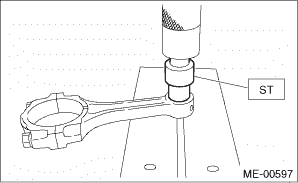 8. The replacement procedure for the connecting rod small end bushing is as follows. (1) Remove the bushing from connecting rod with ST and press. (2) Press the bushing with the ST after applying oil on the periphery of new bushing.